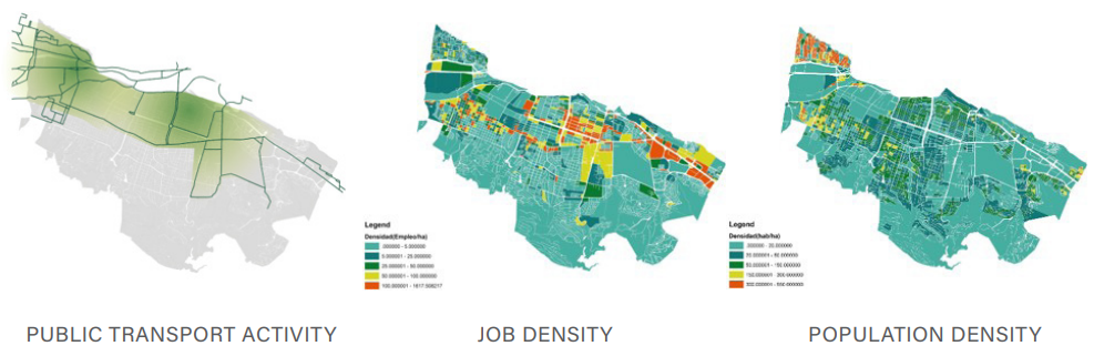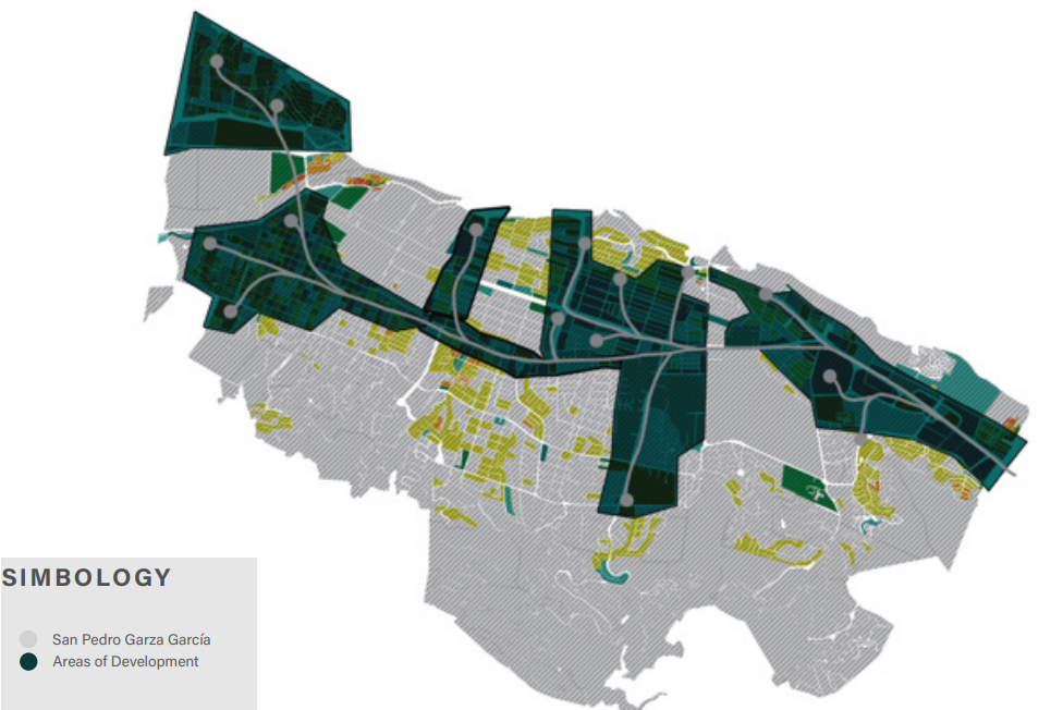San Pedro Garza Garcia is understood as a fragmented municipality, in which twocity schemes are identified: concentrated areas of activity with high percentagesof commercial use and services where public transport routes and employment nucle are concentrated under a linear and dispersed growth trend, on the other handlow density areas and activity with uses mostly of single-family homes under a garden city scheme that work as buffers of the concentrated areas of development.
